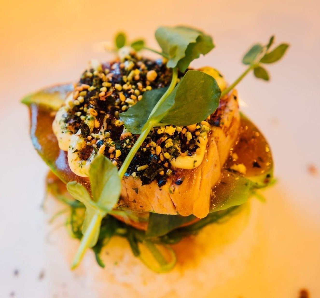 Gele biet, furikake, wasabimayonaise, zwarte knoflook